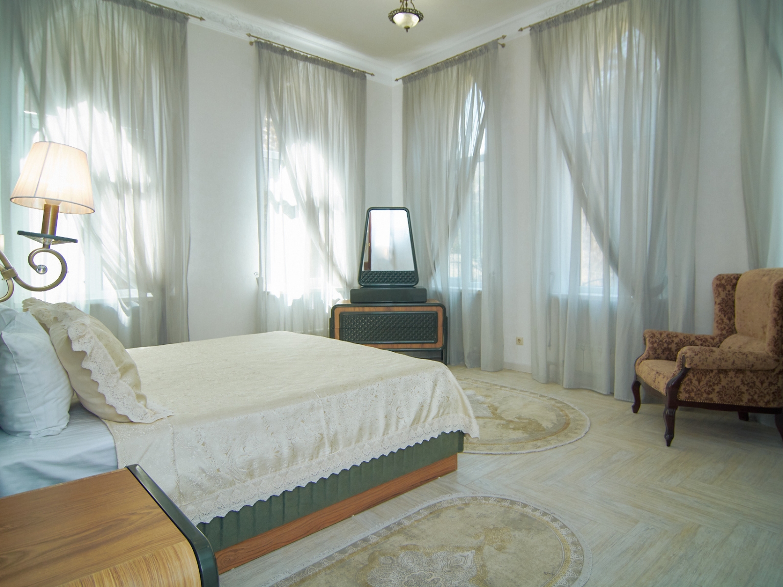 Номер категории «супер люкс» — Современный уютный двухкомнатный номер с кондиционером и собственной ванной комнатой. Максимальное размещение: 3 человек Площадь номера: 38 м² В номере: двухспальная кровать, диван раскладной стол, стул/кресло, LCD-телевизор, шкаф, холодильник, ванная, туалет, раковина, фен, полотенцесушитель, туалетные принадлежности, халат, тапочки, полотенца, Wi-Fi